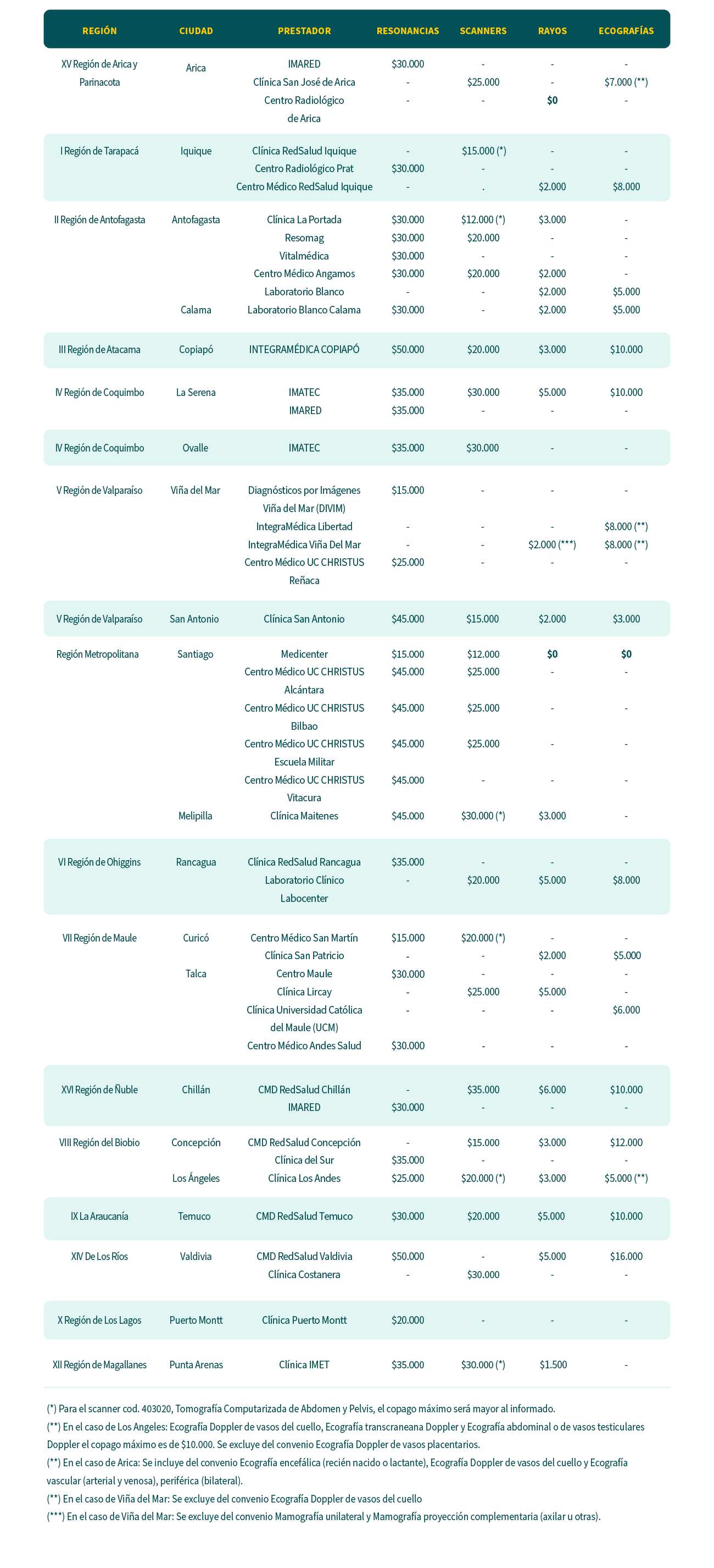 Te contamos sobre nuestros convenios en Santiago y regiones con el mejor valor a pagar en resonancias, scanners, rayos y ecografías. Dependiendo de tu plan, tu copago será como máximo el valor señalado en nuestros prestadores en convenio. (*)